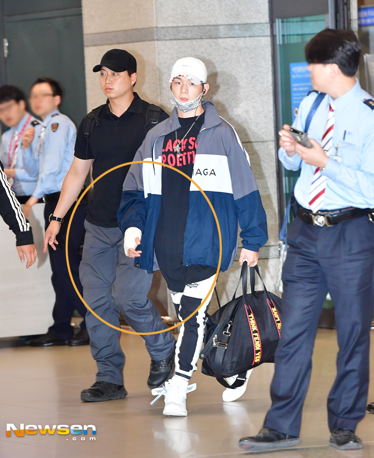 Kang Daniel right hand injury 'A careful gaze at the airport' (Airport fashion) on April 26, 2018 On this day Kang Daniel rolled a bandage on his right hand walking out at the entry site