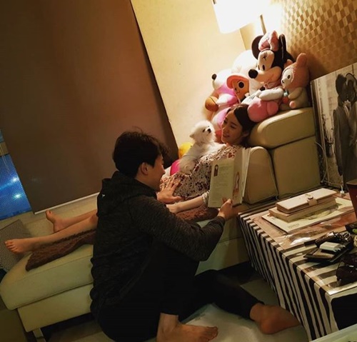 Ahn So-mi, who is lying in the photo, and her husband, who reads a fairy tale book, are creating a happy atmosphere.
