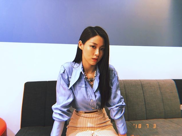 The picture shows Seolhyun sitting on a chair and staring at the camera with his eyes, and the narrow waistline of Seolhyun, which is revealed on a beige skirt, catches his eye. Seolhyun is showing off her health with her coppery skin.