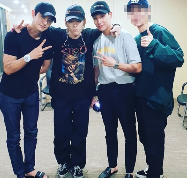 Inside the photo was a picture of Chanyeol and Choi Tae-joon taking a certified photo with Zico. Chanyeol and Choi Tae-joon are beaming in a V-pose: Zico's charismatic look draws attention.