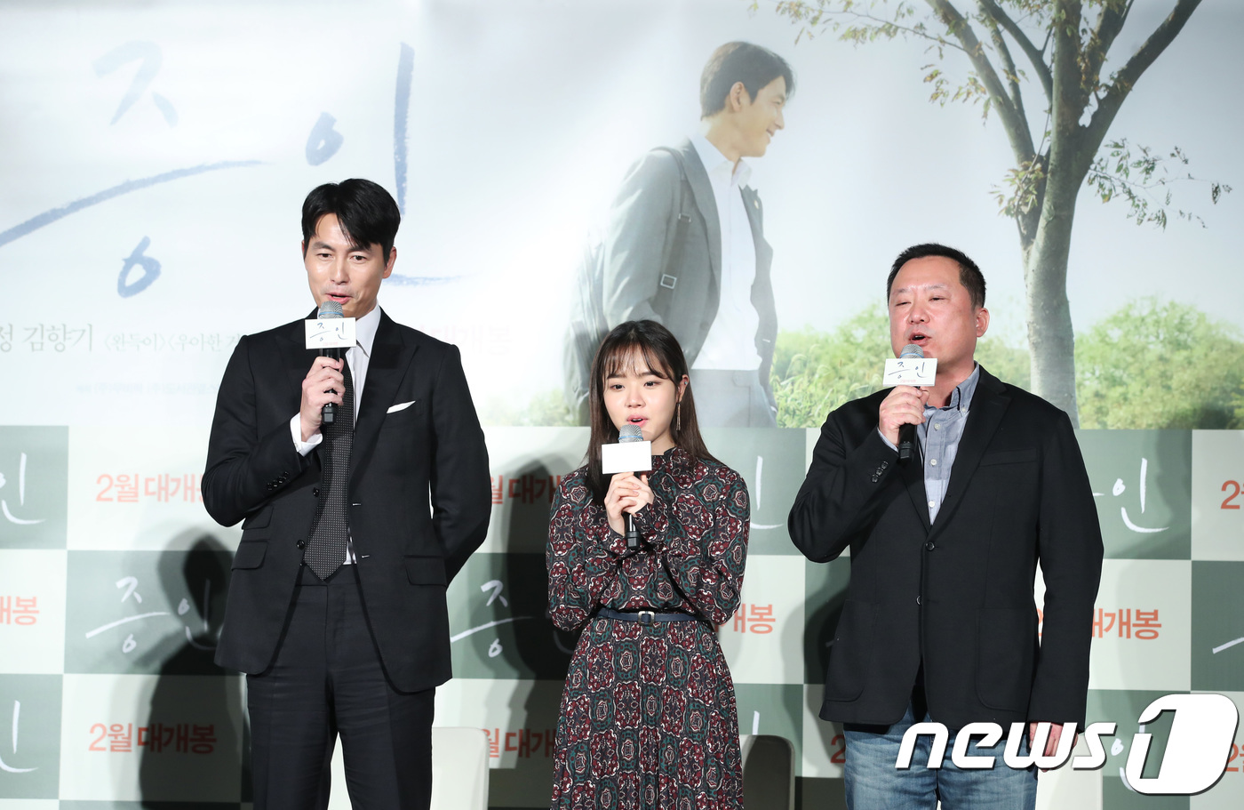 Seoul=) = Actor Jung Woo-sung (from left), Kim Hyang Gi, and Lee Han attend the film 'Witness' production report at the entrance of Lotte Cinema Counter in Gwangjin-gu, Seoul on the 10th and take the witness oath.