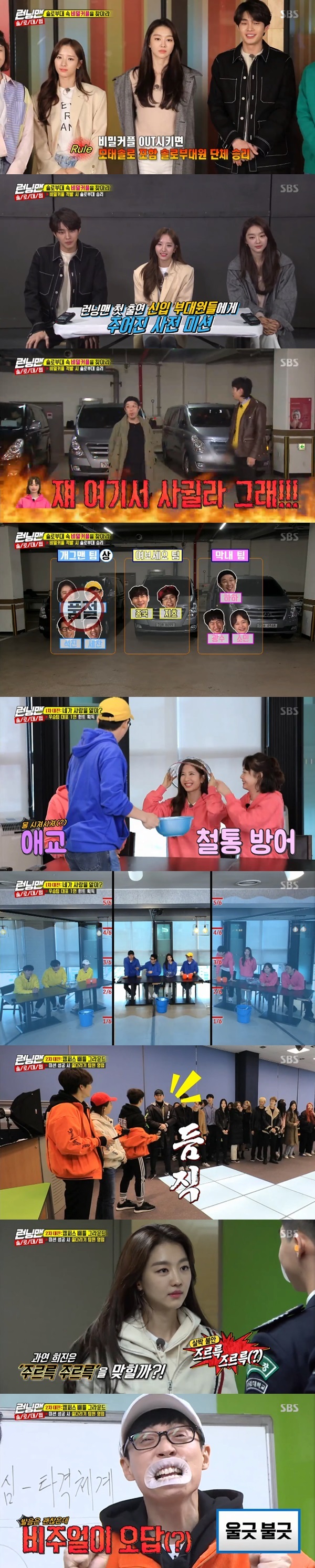 In the first mission, the Yoo Jae-Suk team, which Jang Hee-jin belongs to, won the championship. The defeated Haha team and Kim Jong-kook team came to the Game to drive the water-pump penalty. Jeon So-min hit the right answer and had to be penalised by the Kim Jong-kook team; Song Ji-hyo was suspected of being a secret couple, repeating a ridiculous mistake in the penalty.