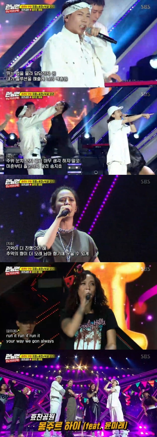 Later, "Bongjur High" at Hyochan Park began; Yang Se-chan, who took the stage, enjoyed the stage, and Song Ji-hyo appeared on a lift. Then, Hidden Card and Yoon Mi-rae of Hyochan Park appeared in a surprise and made a more complete stage. After the stage, Yoon Mi-rae said, "I should have done better, but I am so sorry."