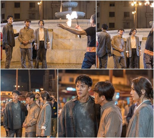 In the drama, Cha Dal-gun, Gohari, and Kim Song Yuqi stand in the colorful and lush atmosphere of the fire show. Everyone is enjoying the scenery of the night with a pleasant and happy expression, and only three people are dressed in messy clothes and are alert with anxious eyes.