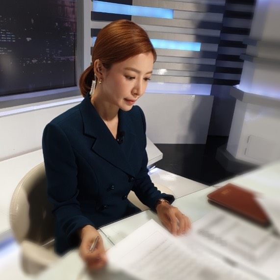 The photo shows the figure of Yoon Se-ah sitting at a desk and looking at the script. The neat hairstyle and calm color suits make a small face and features more prominent.