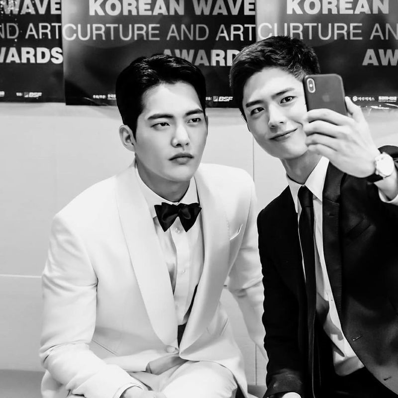 The photo shows Park Bo-gum and Kim Kun-Woo wearing suits; the two Actors sit side by side and take selfies of their mobile phones. The handsome visuals of the two Actors catch the eye.