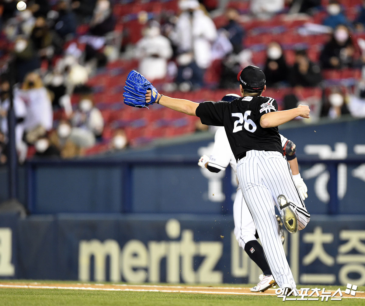 lg Twins and Doosan Bears' semi-playoff first-round game held at Jamsil-dong Baseball park in Songpa-gu, Seoul on the afternoon of the 4th, and lg Cole Hamels Lee Min-ho, the second-companyer, are catching Doosan Jung Soo-bin's bunt and sending him to first base.