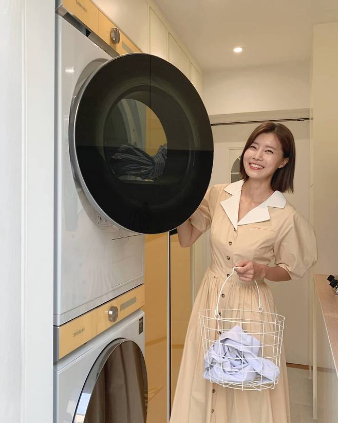 In the photo, Yoo Sun posed with a laundry basket in a laundry room with a clean yet fresh atmosphere. Yu Sun, dressed in a yellow dress as if it were a refreshing yellow appliances and a rut, showed off her elegant figure.