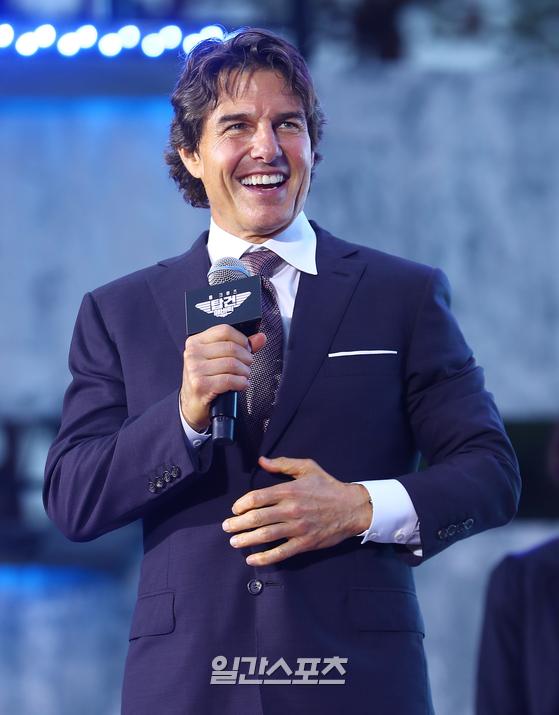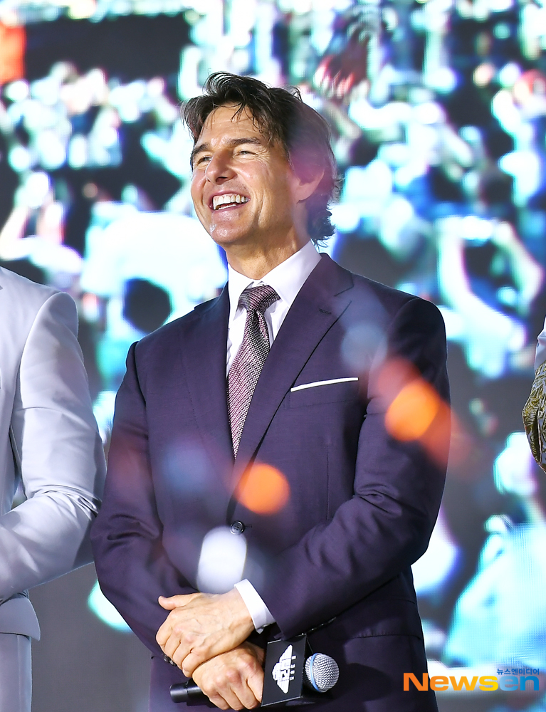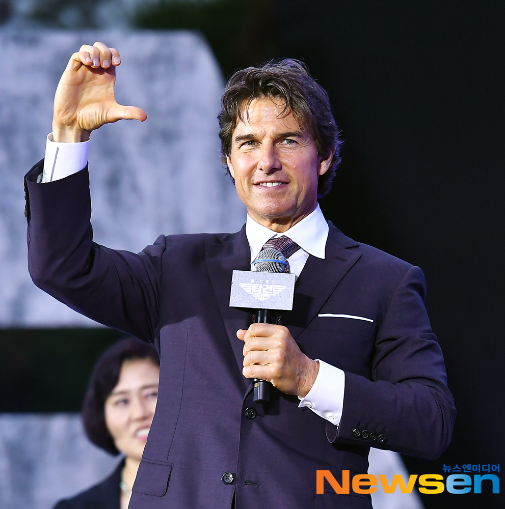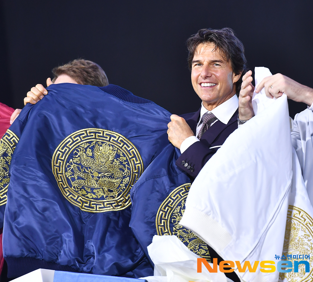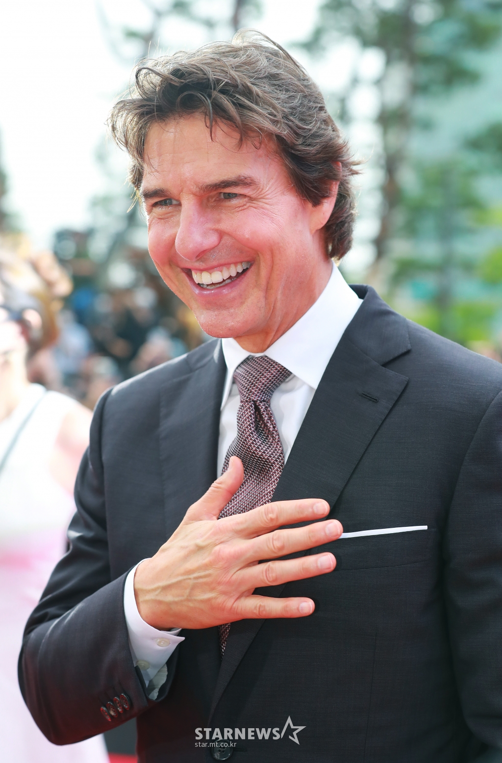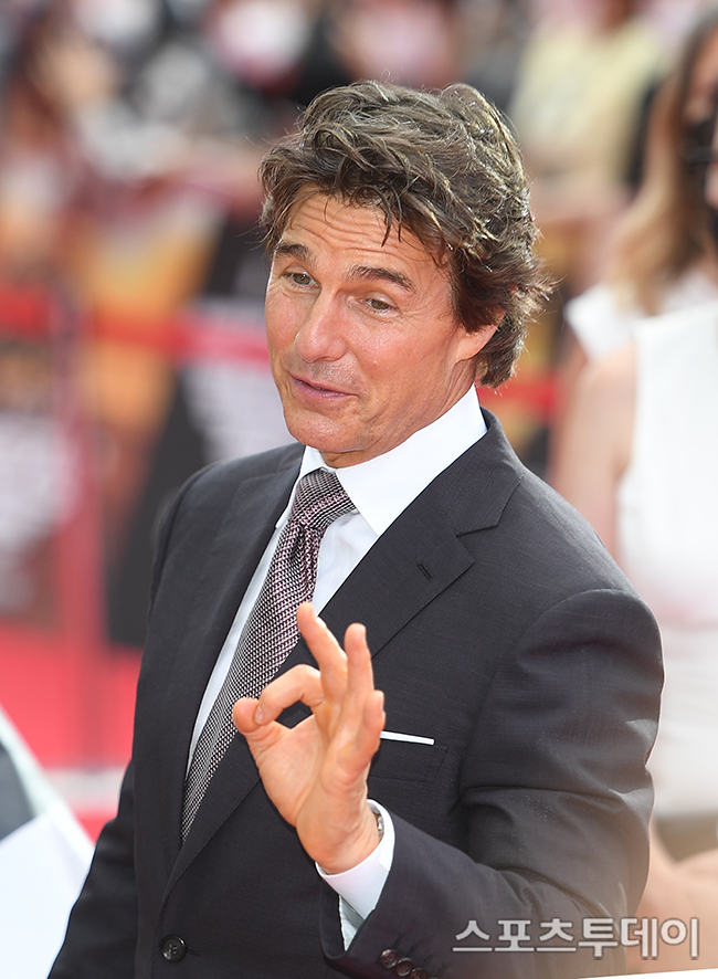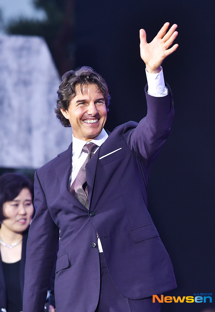 Hollywood actor Tom Cruise attended the red carpet event for the movie 'Top Gun: Maverick' held at the Lotte World Tower outdoor plaza in Jamsil, Seoul on the afternoon of the 19th.