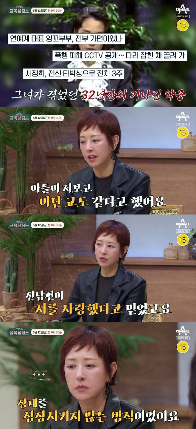 On the 5th, Channel A 'Oh Eun-young's Gold Counseling Center' trailer was released shortly after the broadcast. Seo Jeong-Hee appeared in the trailer and mentioned the violence of her ex-husband, the late Se-won Seo. Seo Jeong-Hee said, "I want to shake off something today", and Seo Jeong-Hee's mother said, "It was so pretty from a young age, I couldn't forget a single memory of being hit and living at that time because it hurts my heart." "My son said I looked like a heretic. I didn't see him tell me not to look at him, and I didn't do it if he told me not to contact him. I resented the kids who were cursing my husband," said Seo Jeong-Hee. "I believed my ex-husband loved me." In particular, Oh Eun Young asked, "Do you still think so?" And Seo Jeong-Hee said, "I think it was an act of love." In response, Oh Eun Young said, "I don't think it was love. It's not love because it's a way of not growing up." Seo Jeong-Hee said, "I was married at the age of nineteen and I was over sixty, but my life is all wrong." Meanwhile, Seo Jeong-Hee has married Se-won Seo in 1983 and has one male and one female. In 2014, it was revealed that Se-won Seo had violated Seo Jeong-Hee, and the two divorced the following year. Se-won Seo died of cardiac arrest during a ringer at a Korean hospital in Phnom Penh, Cambodia, on the 20th of last month.